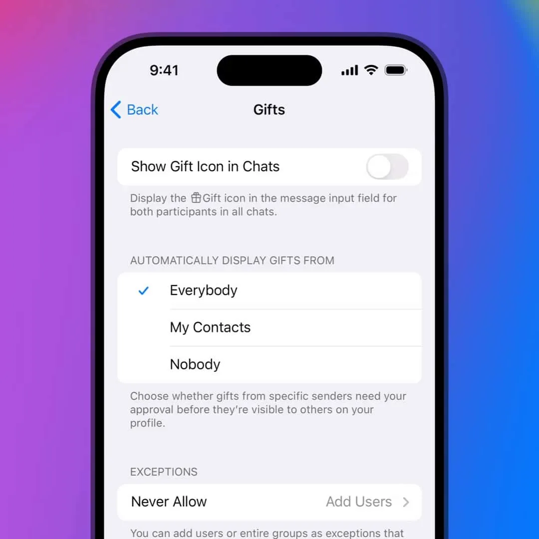 To add the 'Gift' button, control which gifts are shown on your profile or choose which gifts you accept, go to Settings > Privacy & Security > Gifts.